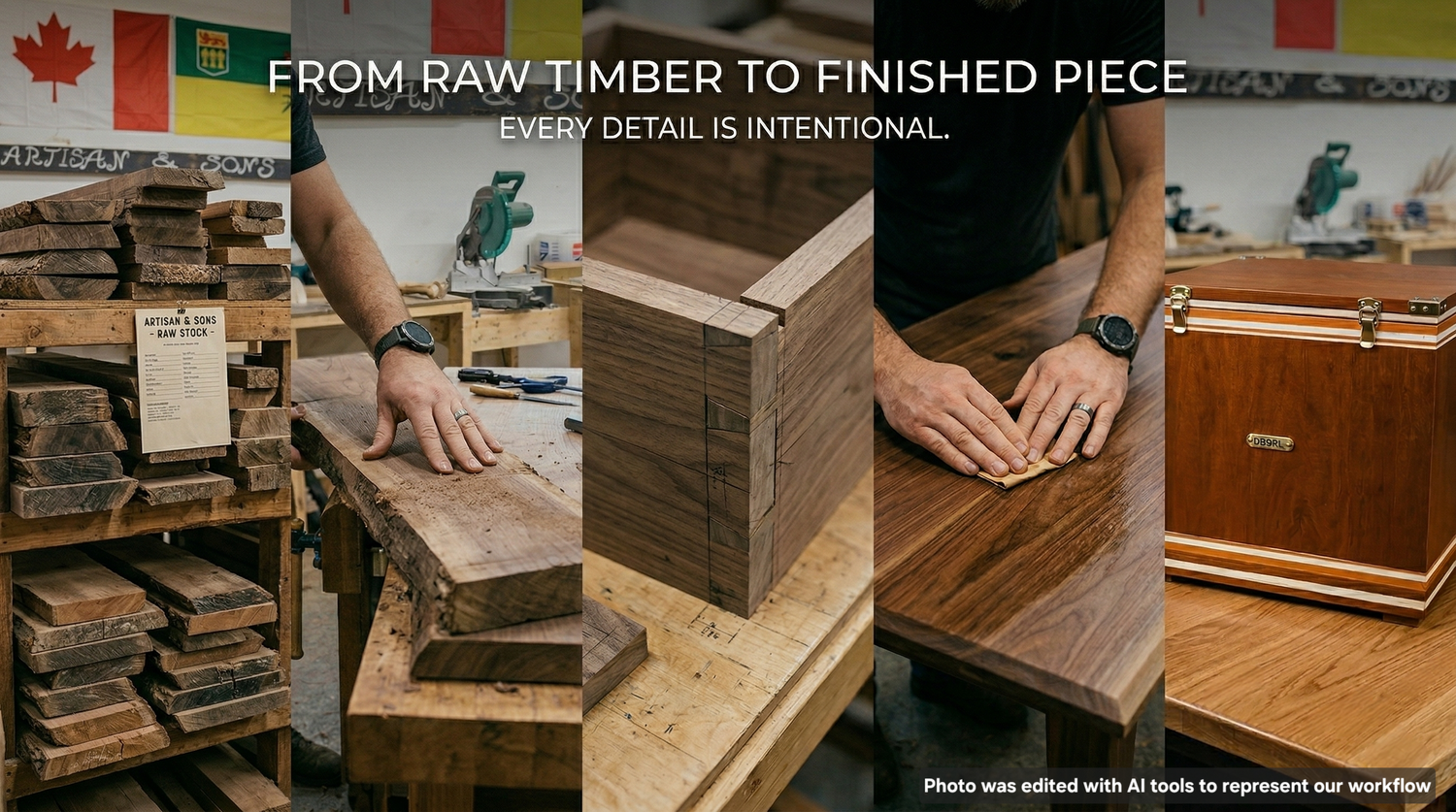 Every piece begins with hand-selected solid wood — chosen for its grain, character, and strength.